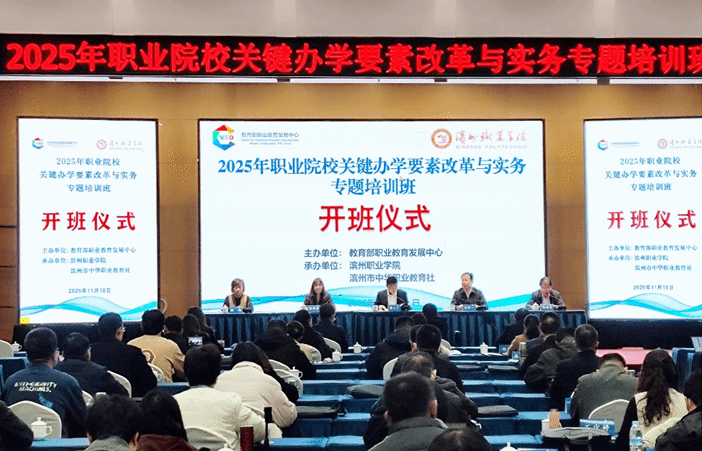 11月18日上午,由教育部职业教育发展中心主办,滨州职业学院承办的“职业院校关键办学要素改革与实务专题培训班”在邹平顺利开班。开班仪式特别邀请到教育部职业教育发展中心教师发展处副处长涂三广、天津职业技术师范大学教授孙翠香出席,滨州职业学院党委书记刘荩一致辞,副院长李明月主持。来自全国33所职业院校的110 余名校领导、部门负责人及骨干教师齐聚一堂,共同开启本次研修学习。